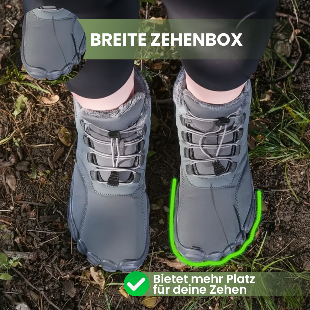 Die breite Zehenbox reduziert Druck auf empfindliche Nerven, während das flexible Barfußdesign natürliche Bewegung und ein leichteres Gehen unterstützt. Dadurch wird tägliche Bewegung für sensible Füße angenehmer.